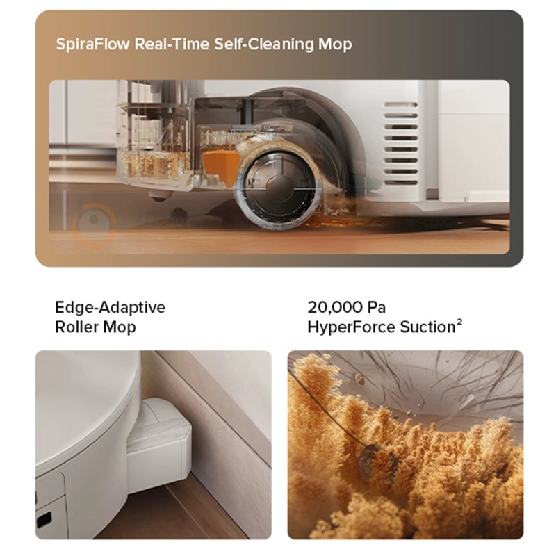 قدرت مکش ۲۰۰۰۰ پاسکال این ربات، حتی کوچکترین گردوغبار، پرز فرش و موهای حیوانات را جمعآوری میکند.