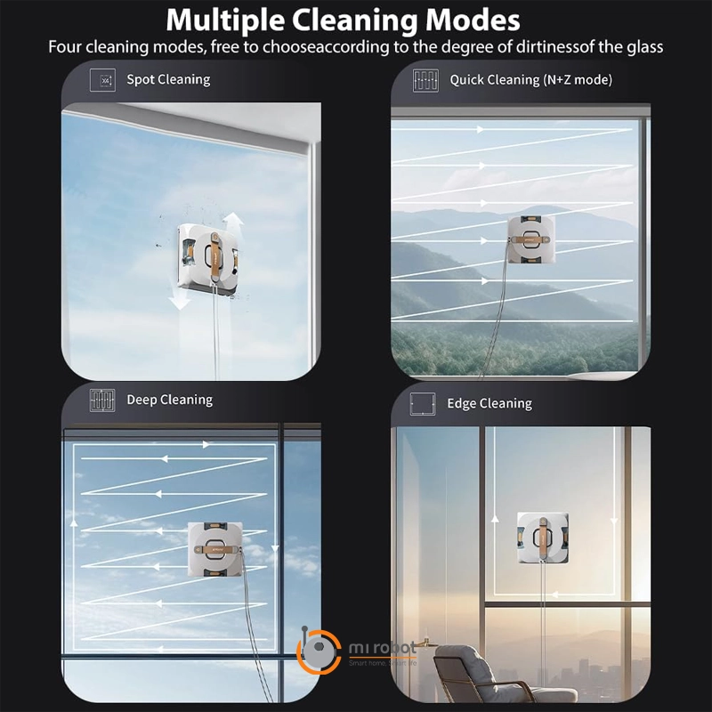 الگوریتم پیشرفته حرکت، کارایی شستوشو را تا ۳۰–۴۰٪ افزایش داده و تمامی سطح شیشه را بدون نقطه کور پوشش میدهد.حالتهای متنوع تمیزکاری
