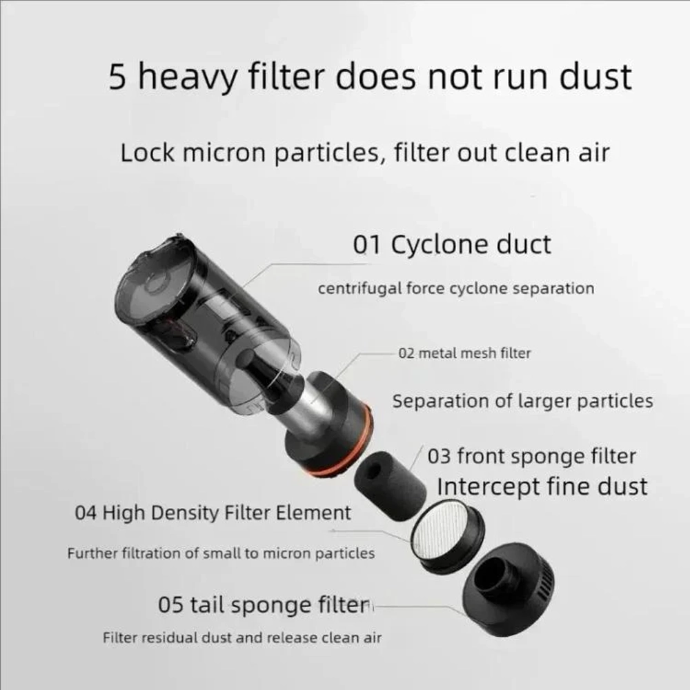 شیائومی در این مدل از موتور بدون برس (Brushless Motor) با راندمان بالا استفاده کرده که علاوه بر قدرت مکش فوقالعاده، اصطکاک کمتر، تولید گرمای پایینتر و طول عمر بسیار بیشتری نسبت به موتورهای معمولی دارد. این موتور قدرتمند قادر است ذرات ریز گردوغبار، شنریزهها، خردهریزهای خوراکی و حتی موهای حیوانات خانگی را از عمق صندلیها، کفپوشها و شکافهای باریک خودرو بهطور کامل جمعآوری کند.