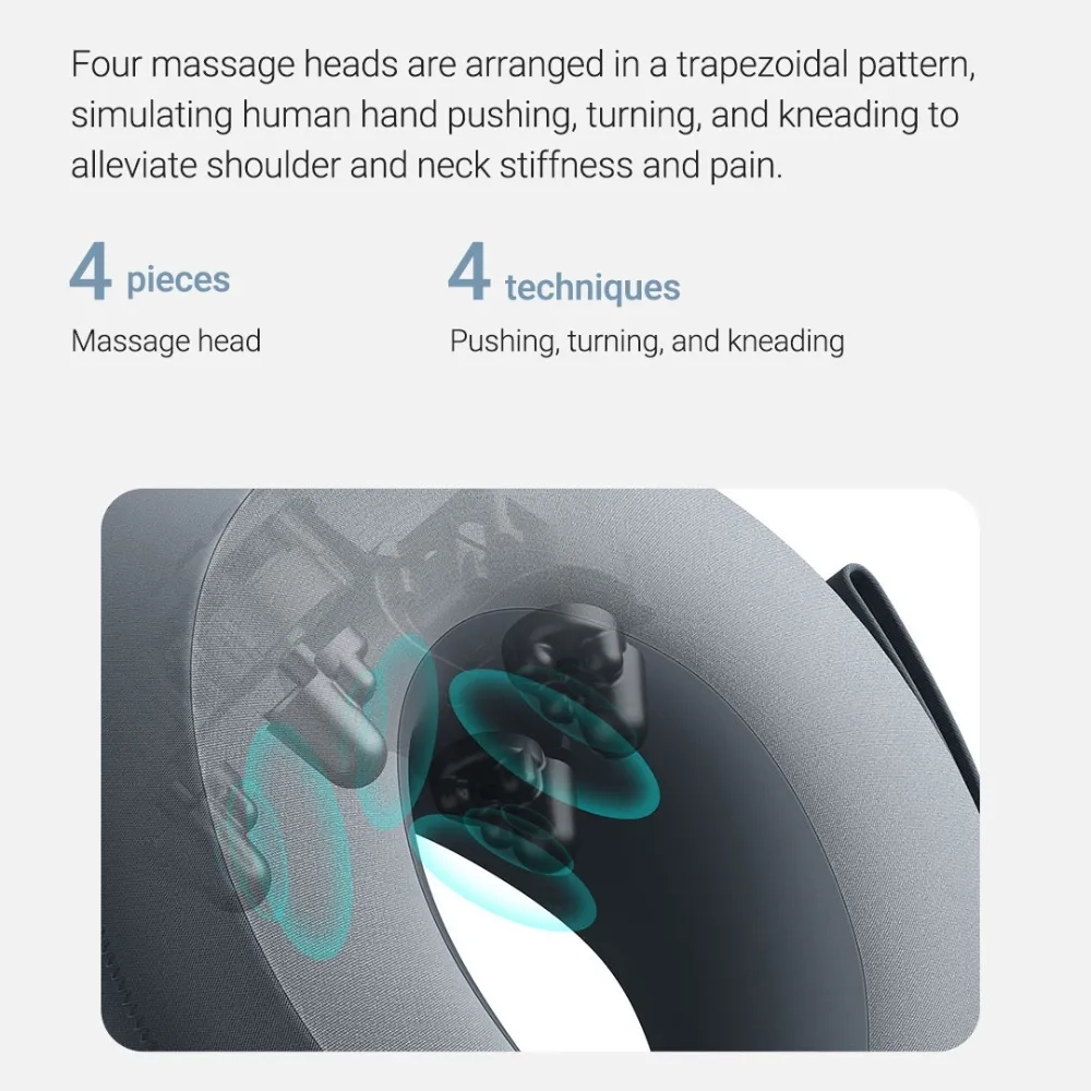 چهار سر ماساژ ذوزنقهای با حرکات فشردن، چرخاندن و ورز دادن، تنش عضلانی را کاهش داده و حس یک ماساژ واقعی را منتقل میکنند. شدت ماساژ از طریق بند جلویی قابل تنظیم است.