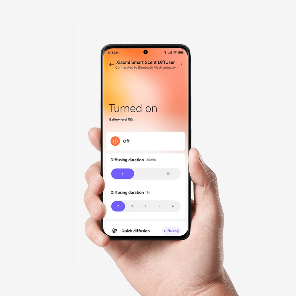 با اتصال دستگاه به اپلیکیشن Xiaomi Home از طریق بلوتوث کممصرف، میتوانید از ۱۵ ترکیب مختلف (۳ فاصله زمانی × ۵ مدتزمان اسپری) برای تنظیم غلظت رایحه استفاده کنید.