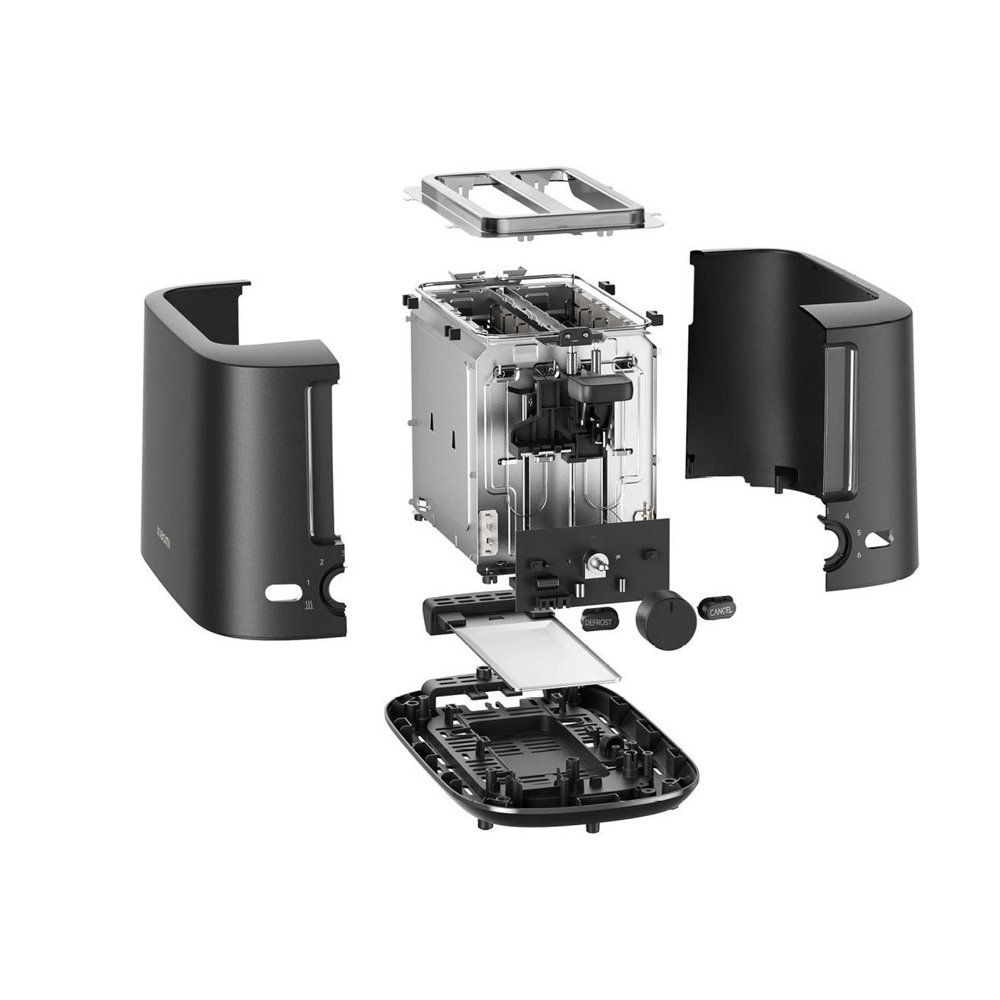 توستر XMTSJ01FD با بدنه مشکی و مینیمال، بهراحتی با انواع دکوراسیون آشپزخانه هماهنگ میشود. طراحی جمعوجور دستگاه باعث شده تا فضای زیادی اشغال نشود و بتوانید آن را روی کابینت یا داخل قفسه نگهداری کنید. بدنه مقاوم و باکیفیت توستر حس دوام و طول عمر بالا را به کاربر منتقل میکند.